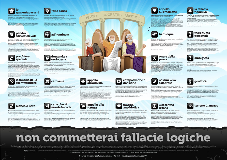 Una fallacia logica è un ragionamento mal posto. Le fallacie logiche sono come trucchi o illusioni mentali, e vengono spesso usate subdolamente da politici e media per ingannare le persone. Non farti ingannare! Questo sito è stato pensato per aiutarti a identificare e mettere in evidenza casi di logica fraudolenta ovunque quest’ultima possa alzare la sua orribile e incoerente cresta. Passa il mouse sulle icone e clicca per vedere degli esempi. Se vedi qualcuno commettere una fallacia logica online, mandagli un link alla sua fallacia, ad esempio:https://yourlogicalfallacyis.com/it/lo-spaventapasseri